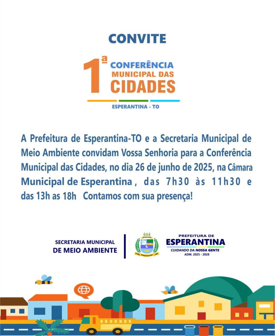 A Prefeitura de Esperantina-TO e a Secretaria Municipal de Meio Ambiente convidam Vossa Senhoria para a Conferência Municipal das Cidades.