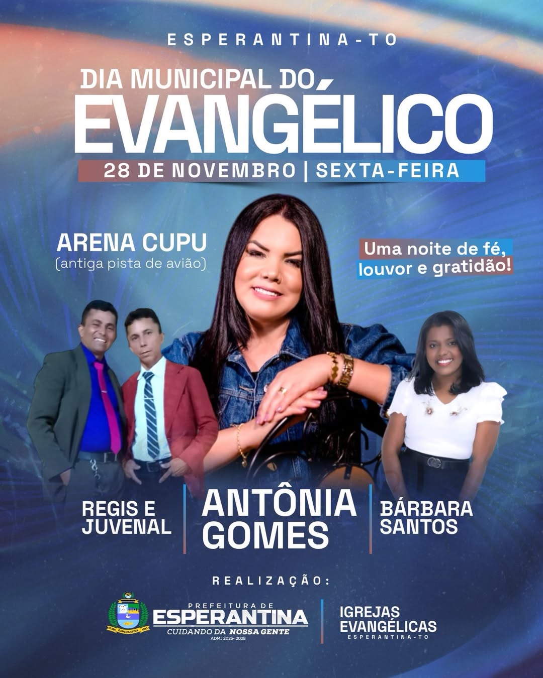 A Prefeitura Municipal de Esperantina - TO, em parceria com as igrejas evangélicas do município, realizará no dia 28 de novembro, sexta-feira, uma programação especial em comemoração ao Dia do Evangélico. O evento celebra a fé, a união e o papel fundamental que a comunidade evangélica desempenha no fortalecimento dos valores sociais e espirituais de nossa cidade.
